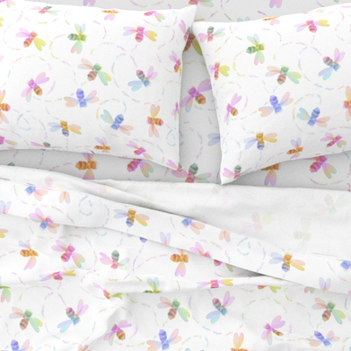 A whimsical surface pattern with buzzing bees and soft rainbow trails. The gentle color palette and playful motion make it perfect for baby products and seasonal home goods.